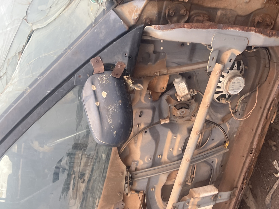 In Ijanikin, Nigeria, the image presents the front left portion of a severely degraded, dark-colored vehicle. The windshield is extensively shattered, exhibiting a pronounced spiderweb fracture pattern. The outer door panel is absent, exposing the internal door mechanism, which includes a window regulator motor, associated wiring, and a circular speaker unit. These internal components, along with the visible sections of the inner door frame and the vehicle's lower body, are uniformly coated in a thick layer of reddish-brown dust and show advanced stages of rust. The exterior side mirror, dark and oblong, displays significant paint chipping and appears to be secured by rusted, possibly makeshift, metal brackets. No human subjects are present within the frame. The immediate environment beneath the vehicle consists of reddish-brown earth.