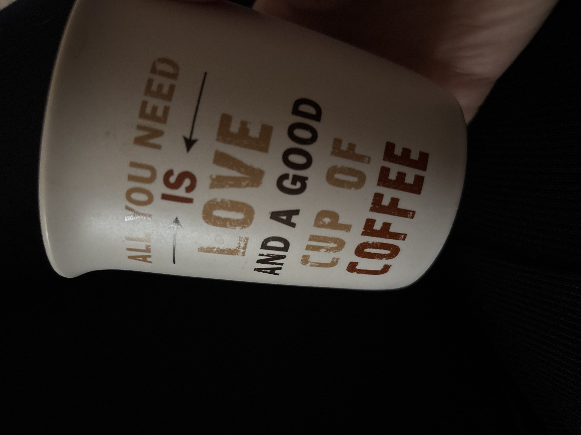 A human hand, with visible skin tones, grasps a white ceramic mug, positioned at a slight angle against a uniformly dark, possibly black, background. The mug displays text in various colors and fonts: "ALL YOU NEED IS" is in a light brown/gold, followed by "LOVE" in the same shade, with small black arrows pointing towards it from the word "IS". Below this, "AND A GOOD CUP OF" is printed in a dark, possibly black, color. The final word, "COFFEE," appears in a darker red-brown shade. The text shows a slightly distressed or textured print. The scene takes place in the city of Petrich, Bulgaria.