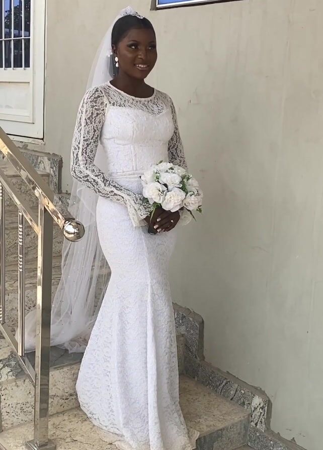 bride wearing a white lace wedding gown, with long sleeves and a mermaid silhouette, and a white veil