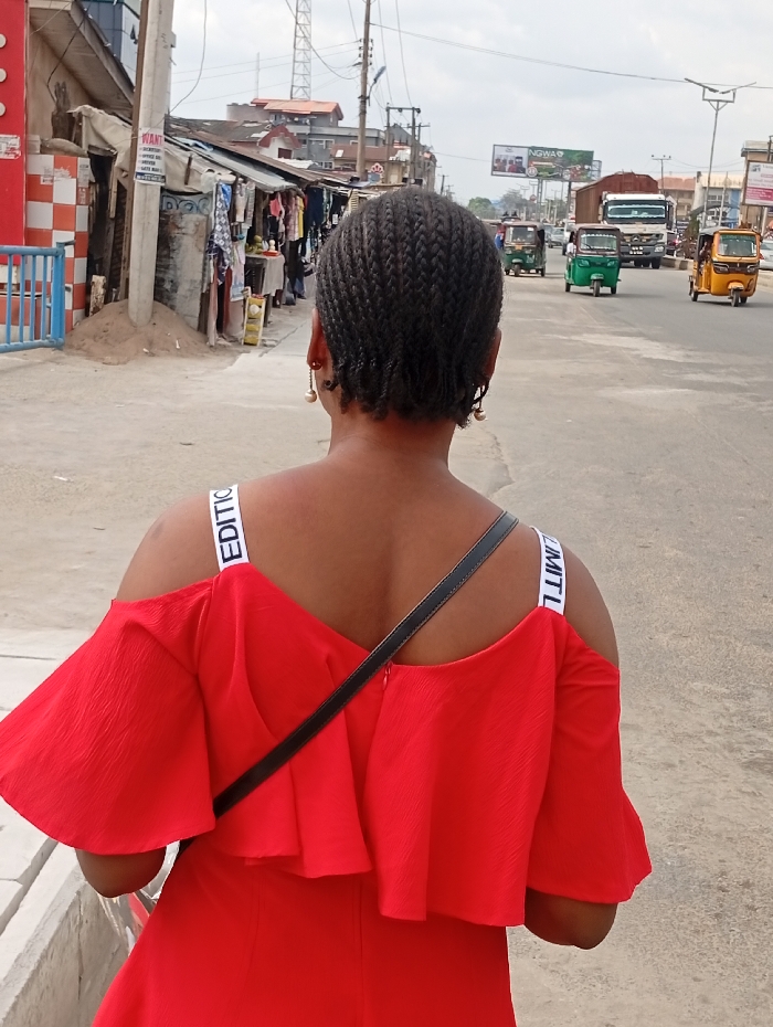 A woman in a red off-the-shoulder dress walks away from the camera. Her hair is braided. She has a black bag slung over her shoulder. The background shows a street scene with buildings and vehicles. There are shops on the side of the street. The traffic includes trucks and auto rickshaws.