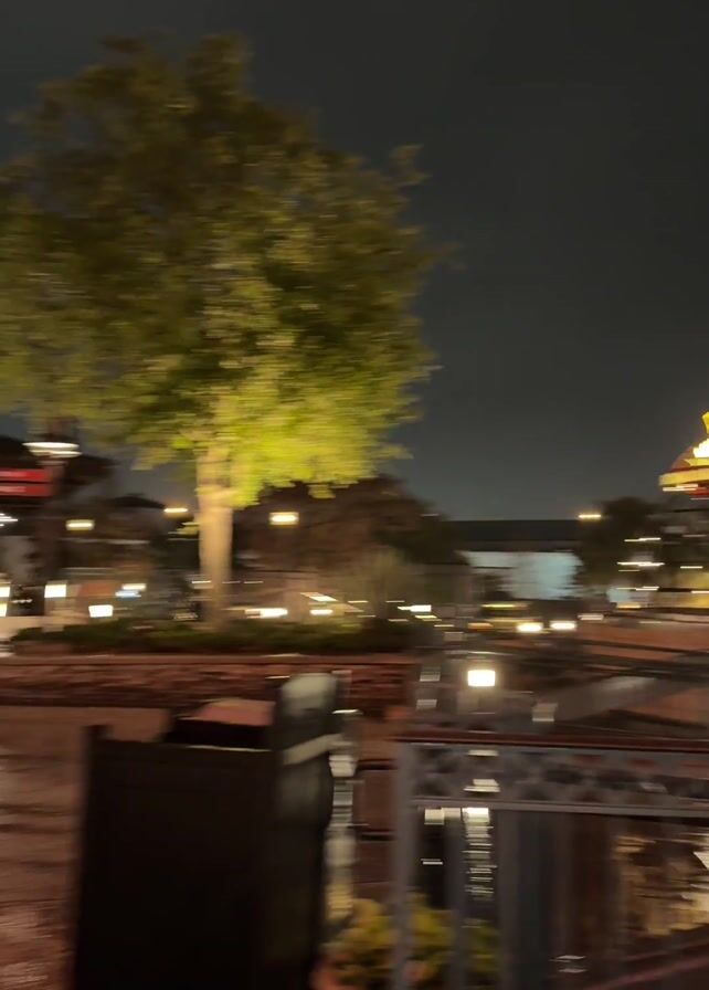 n outdoor area at night after a rain. In the background, a building with lights and a large dome-shaped structure can be seen. As the video progresses, it shifts focus to a brick building with multiple windows, a dark roof, and outdoor seating with red umbrellas. People are walking in the wet paved area in front of the building. A sign advertising a food and drink deal stands nearby. The overall atmosphere is slightly blurred due to the rain and darkness.