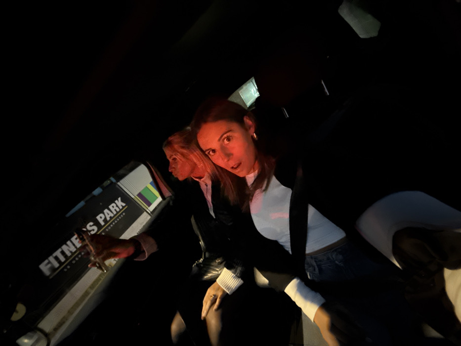 Two women are in a dimly lit setting, possibly a car. One has reddish-brown hair, hoop earrings, a white top with black sleeves, and jeans. She's looking at the camera with an expression of surprise. The second woman, slightly behind, has blonde hair and is wearing a dark blazer with a white top. A sign with "FITNESS PARK" is visible on the left, illuminated by a light source, adding to the darkness surrounding the subjects.