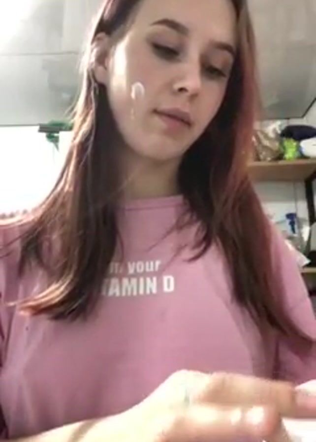 A young woman with long reddish-brown hair applies facial cream in a well-lit indoor space. She is wearing a pink T-shirt with white text. The camera angle is directly in front of her. She is holding a white jar of cream in her left hand, and she applies small dots of cream on her cheek and forehead with her right hand before blending it in. A shelf is visible in the background.