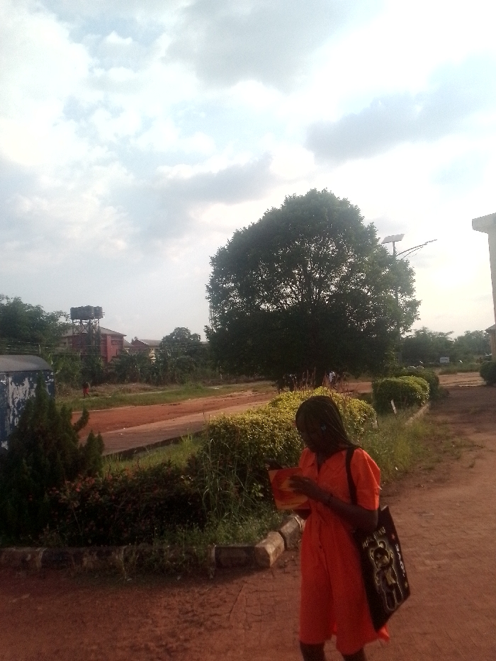 An outdoor scene is depicted under a partly cloudy sky in the city of Unknown, Unknown. In the foreground, a Black female subject stands slightly left of center, wearing an orange short-sleeved collared shirt-dress and braided hair. She holds a rectangular object, likely a book or electronic device, with both hands, directing her gaze downwards. A dark shoulder bag featuring a light-colored graphic hangs from her left shoulder. She stands on a reddish-brown ground surface, possibly compacted dirt or unpaved earth. To her left, a low concrete curb separates the ground from a landscaped area containing green and brown foliage and a smaller conical evergreen shrub. In the mid-ground, a wide, reddish-brown dirt path or road traverses the scene horizontally. A large, densely foliated green tree is centrally positioned behind the female subject. A utility pole with an attached solar panel is visible behind the tree's canopy. To the far left mid-ground, a dilapidated blue-grey structure is partially visible behind vegetation. A small, distant figure, possibly a child, dressed in red, stands on the dirt path in the left mid-ground. The background shows multiple distant buildings, including one with a red-orange roof, and a large, dark water storage tank mounted on a metal frame structure on the left side of the horizon. The sky is predominantly light grey and white with scattered cumulus clouds.