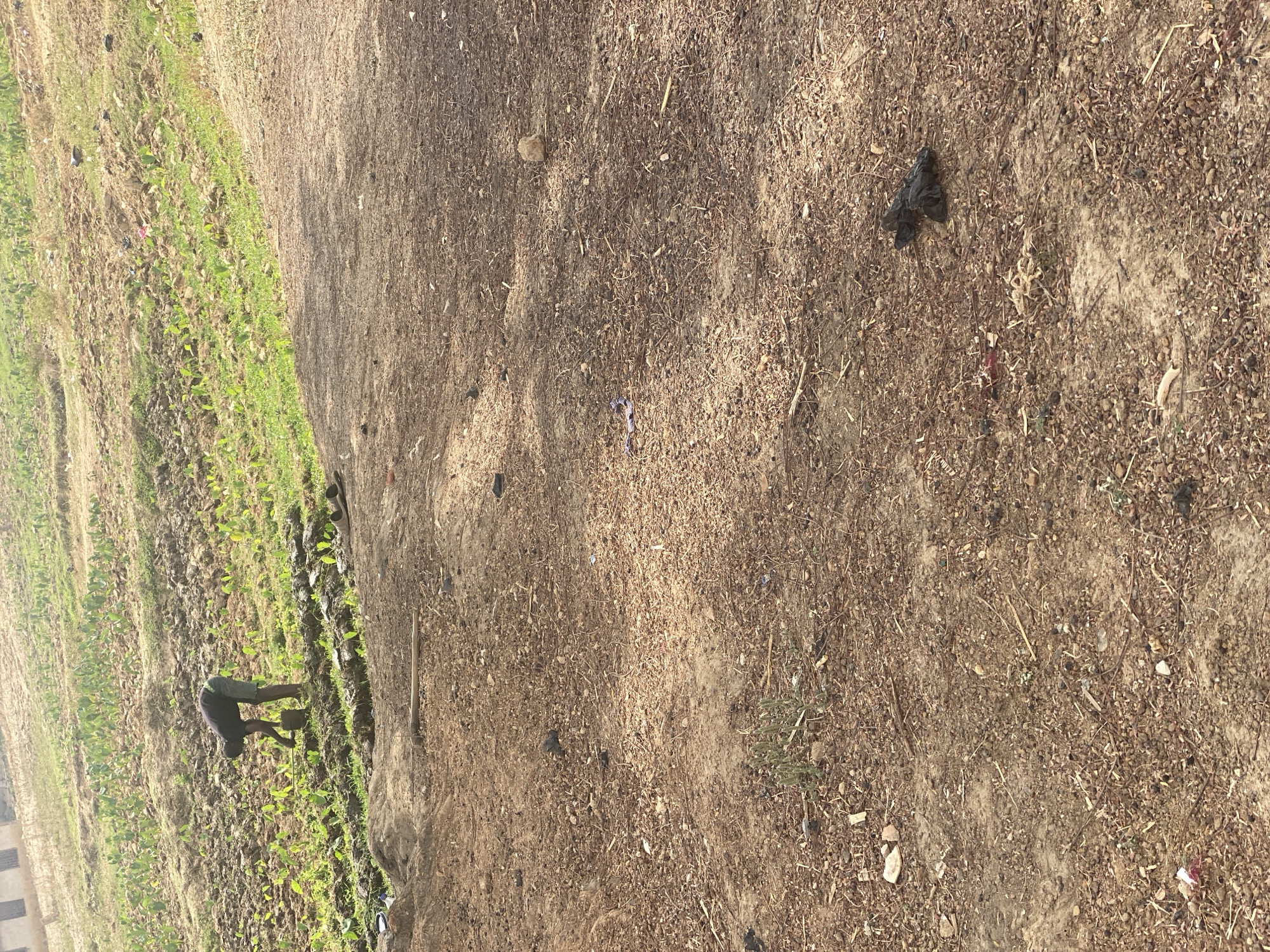 The scene depicts an outdoor agricultural environment in Sabon Tasha, Nigeria. In the foreground and midground, the ground consists of dry, reddish-brown earth mixed with small stones and sparse dry vegetation. Scattered debris includes small pieces of litter and a prominent black plastic bag in the lower right. A wooden tool handle, possibly from a hoe, lies horizontally on the ground in the midground. To the right of the cultivated area, a pair of dark-colored sandals rests on the bare earth. In the background, the terrain slopes upward, transitioning into a cultivated field. This area features freshly turned dark soil in rows, interspersed with numerous small, vibrant green plants, indicating active agriculture. One adult individual, an apparent male, dressed in a dark short-sleeved shirt and dark shorts, is observed bent over in the field, engaged in manual labor. He is positioned with his back mostly toward the viewer, interacting with a dark, rectangular object on the ground while tending to the young crops. In the far upper background, a light-colored building with dark window frames is visible on the distant horizon. The overall lighting suggests daylight conditions.