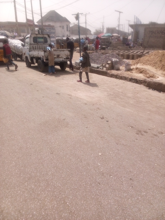 The image displays an outdoor street scene in Dakata, Nigeria, under bright, hazy daylight conditions