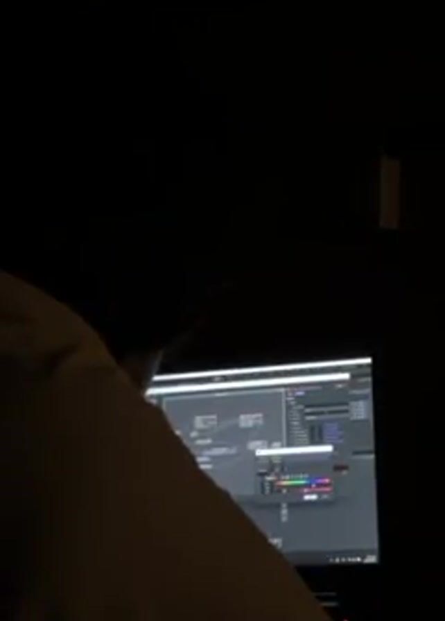 person sitting in front of a computer in a darkened room. The person is wearing a light-colored shirt and appears to be working on a computer graphics program. The screen displays a node-based editor with color palettes and a 3D model of a Nike jacket. They are manipulating the colors of the jacket.