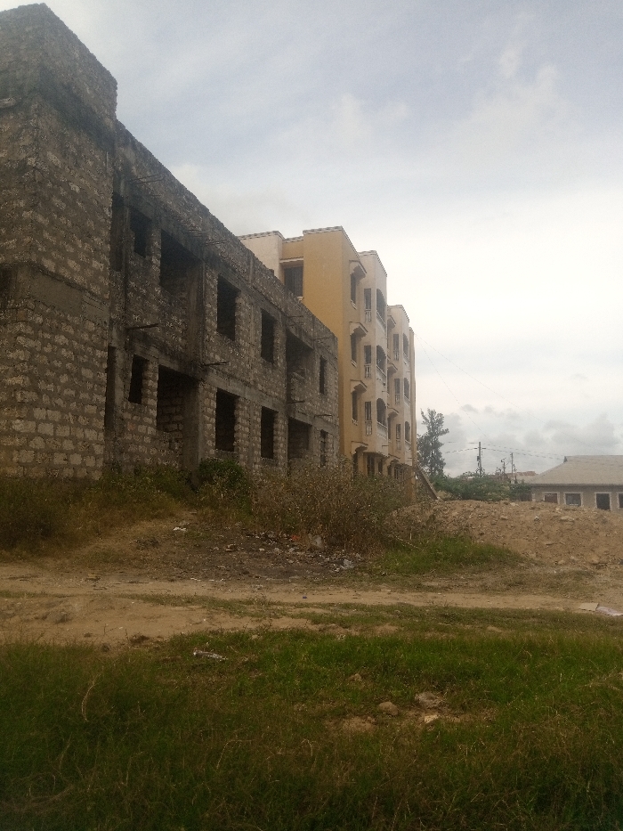 The image depicts an urban development scene in Mtopanga ward, Kenya, under an overcast sky. In the foreground, the ground consists of uneven bare earth interspersed with patches of sparse green grass and dry shrubs. On the left, a multi-story building constructed from rough-hewn grey concrete blocks is visible, appearing to be in an unfinished state of construction or disrepair. This structure features multiple rectangular openings for windows and doors, lacking frames or glazing, and exhibits exposed rebar elements. Adjacent to this unfinished structure, on the right, stands a multi-story building painted light yellow. This building appears largely completed, featuring multiple balconies with balustrades and regularly spaced windows. In the further background, to the right of the yellow building and behind a mound of excavated earth, a low-rise building with a grey roof is partially visible. Sparse vegetation, utility poles, and overhead lines are also present in the distance. No individuals are present in the scene.