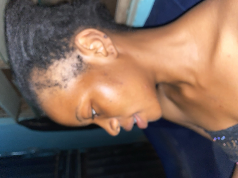 The image displays a close-up, side-profile view of an individual in Minna, Nigeria. The subject, with dark skin, is oriented facing left within an indoor setting. Dark, natural, textured hair is styled, exhibiting areas of shorter growth or thinning along the hairline near the forehead and temple. The left ear is visible, with a small dark object, possibly an earring, present. The subject's mouth is slightly open, revealing full lips. Small, dark blemishes are visible on the left cheek. The individual is wearing a dark, possibly sequined or textured, strapless garment. The background is out of focus, featuring a dark blue object to the left and a lighter blue or teal surface in the upper right, consistent with an interior location under dim lighting conditions.