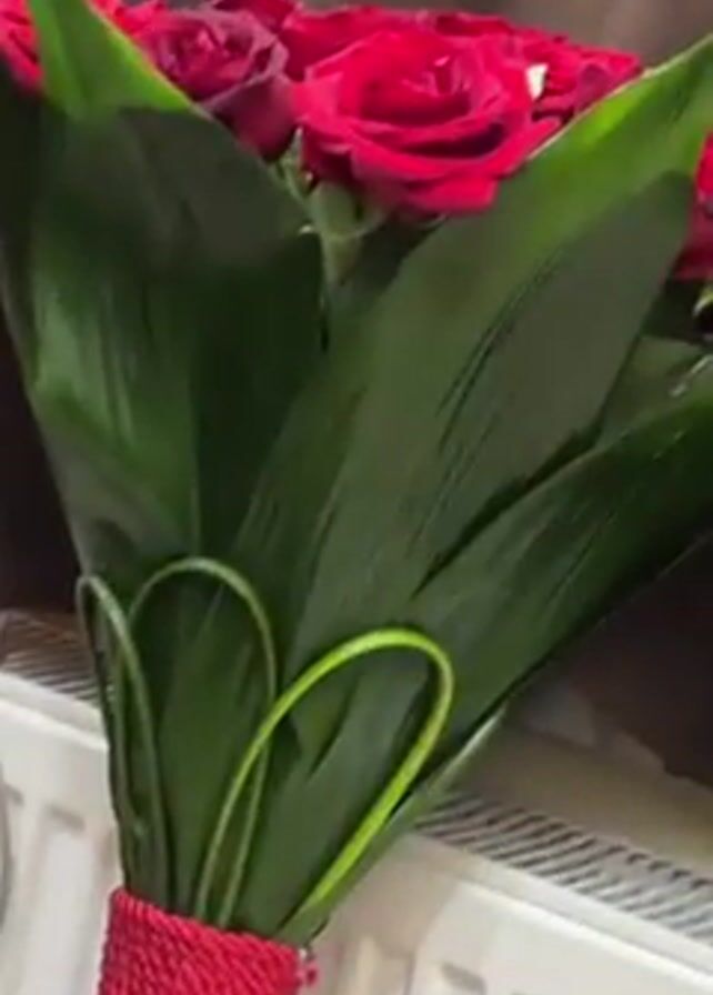 - "A bouquet of red roses and green foliage with a red beaded wrap around the stems leans against a white radiator in front of a brown and white curtain" by FM-nHXd53, licensed under CC BY 4.0