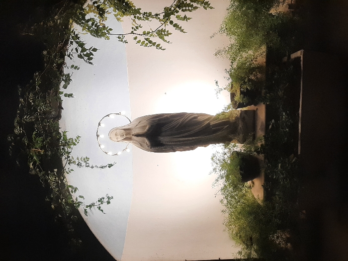 The image displays a statue of the Virgin Mary situated within an outdoor alcove or archway at night, located in As-Salihiya Municipality, Syria
