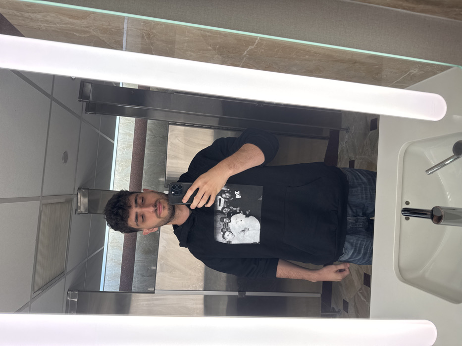 A male individual is depicted in a mirror selfie within what appears to be a modern public restroom