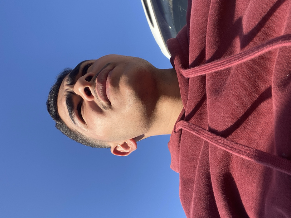 A low-angle shot focuses on a person's face against a clear blue sky. The individual wears a maroon hoodie with visible drawstrings. The camera angle emphasizes the nose and mouth, and the person's eyes are closed or nearly closed. The left side of the face is in shadow, while the right side is well-lit. Part of a white vehicle is visible in the upper left corner.