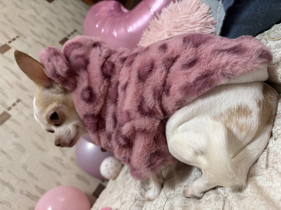 A small, short-haired dog, primarily white with light brown patches, is positioned in an upright sitting posture, facing right and looking slightly upward. The dog is wearing a pink faux-fur coat with a faint darker pink leopard print pattern, covering its back and upper body. Its hind legs are partially visible, tucked beneath its body on a light beige, textured fabric surface. In the background, a deflated pink balloon is visible to the far left. Directly behind the dog, a lavender-colored balloon is partially obscured by a small, white, spherical object with pink spots. To the right, a portion of a larger, shiny pink foil balloon is present, alongside a fluffy pink decorative item. A section of dark blue fabric is also visible on the far right. The background wall or surface is light-colored with a subtle patterned texture. The scene is depicted in an indoor setting within the city of Yambol, Bulgaria.