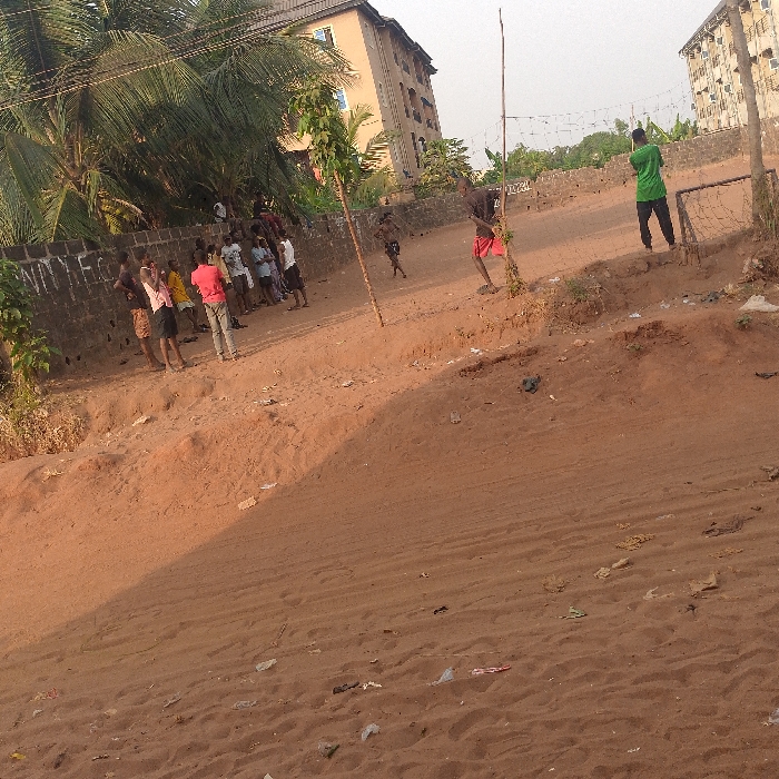 A group of people are gathered on a sandy, sloped area near buildings and lush trees. Some individuals are standing along a wall, while others are playing a game of volleyball with a makeshift net. A person in a green shirt stands near a goal post. The terrain appears uneven and sandy, with scattered debris. The scene conveys a sense of community and casual outdoor activity.