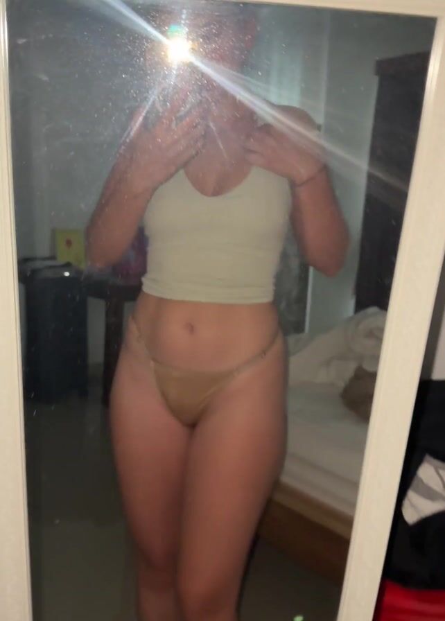 A woman stands in front of a large, white-framed mirror, taking a selfie. She is wearing a light-colored tank top and tan-colored underwear. Her face is obscured by the glare from the camera flash. The room behind her contains a bed, a bedside table, and some miscellaneous items. The wall is painted a light color. The camera slowly zooms out.