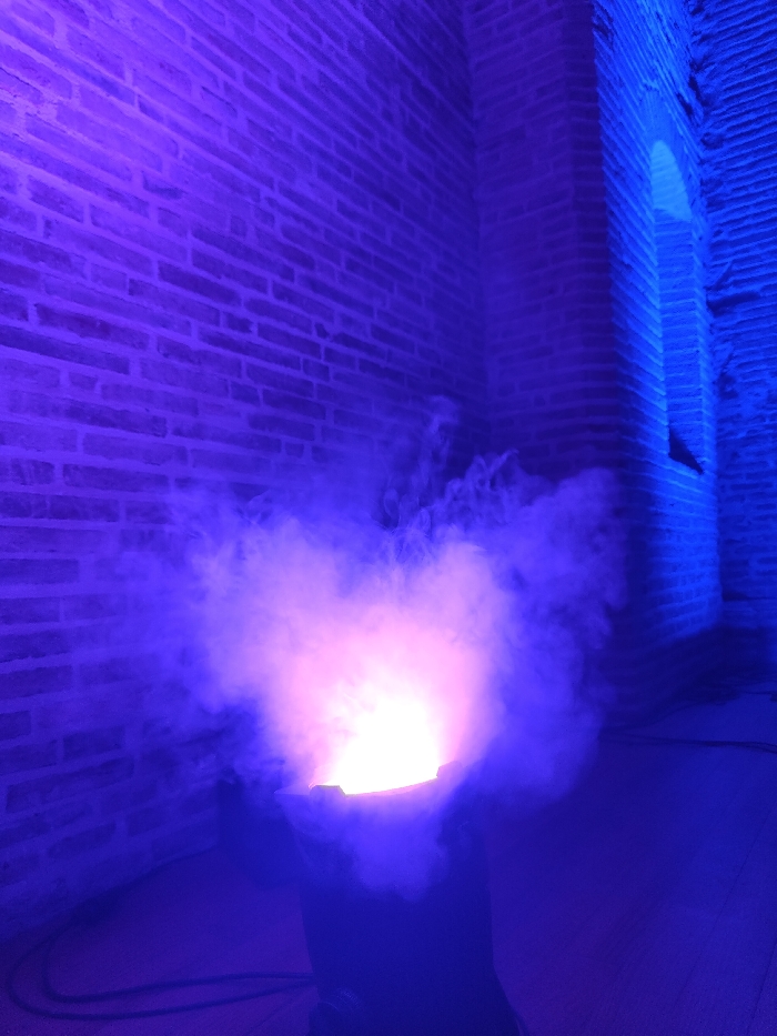 The scene depicts an interior space within a historical brick building in Toulouse, France. A black, cylindrical stage effect device is centrally positioned in the lower frame, emitting a brilliant, intense pinkish-white light upwards and producing a dense volume of white theatrical fog. This fog rises and disperses into the ambient colored lighting, appearing purplish-blue. The left wall, constructed of reddish-brown brick, is uniformly illuminated with a deep purple hue. The right wall, also reddish-brown brick, features a prominent arched recess or opening and is lit with blue light. The floor is a dark, flat surface, with two dark electrical cables extending horizontally from the stage device towards the lower left. No human subjects are present; the scene captures an active technical display utilizing specialized lighting and atmospheric effects.