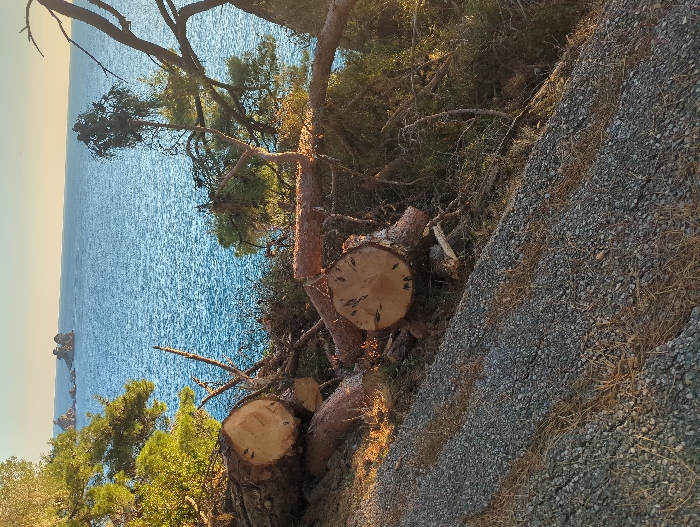 The image depicts a coastal scene in Mirište, Montenegro, illuminated by natural sunlight, likely late afternoon or early morning. In the immediate foreground, a grey gravel path or roadside shoulder extends diagonally from the lower-left to the upper-right. It is sparsely covered with dry, brownish pine needles and debris. Immediately adjacent to the gravel path, a sloping embankment is visible, covered in dense green and brown vegetation, including branches and foliage. Dominating the midground are several freshly cut logs from coniferous trees, piled on the embankment. Two prominent logs are visible with their circular cross-sections facing the viewer, exhibiting light-colored wood with concentric growth rings. The bark on these logs is a reddish-brown. Surrounding the logs are additional tree branches, some appearing recently cut or broken, and a scattering of natural shrubbery. In the background, a large expanse of clear blue water, characteristic of the Adriatic Sea, stretches towards the horizon. The water surface shows slight ripples, reflecting the sunlight. Several small, dark rock formations or islets are visible in the distance, rising from the sea, most notably a cluster towards the left of the frame. The sky above is a pale blue, transitioning to a warmer, yellowish hue near the horizon. No individuals or animals are present in the scene.