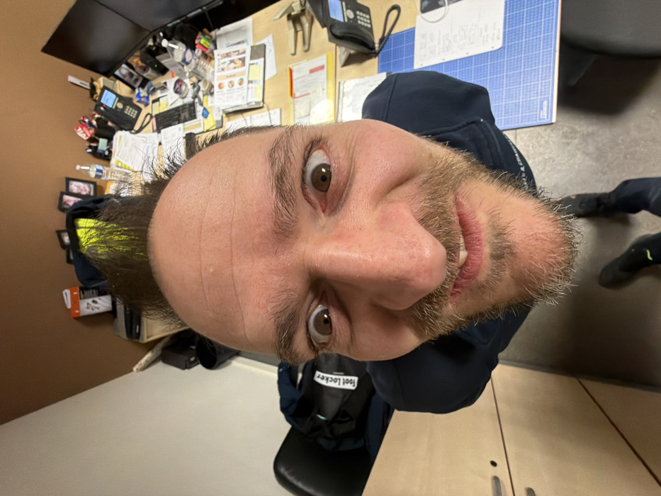 A man takes a close-up selfie, face filling the frame, eyes wide. He has brown hair, a beard, and fair skin. The background shows a cluttered desk with a phone, papers, and office supplies. A portion of a chair and a cabinet are visible in the lower part of the image. A "Foot Locker" logo is visible on his jacket's pocket.