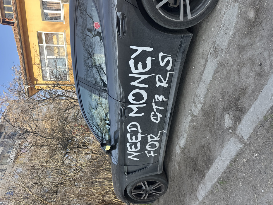 The scene is set in Plovdiv, Bulgaria, under a clear blue sky. A dusty, dark-grey four-door Porsche Panamera is parked on an unpaved surface. Its entire driver's side is marked with white spray paint spelling "NEED MONEY FOR GT3 RS" in block letters with a distinct dripping effect. A small red circular sticker is affixed to the rear passenger window. The vehicle's wheels are dark multi-spoke rims, with the visible rear tire bearing "Continental" branding. The ground beneath the car is a dry, unpaved area of dirt and sparse weeds, featuring two parallel, worn concrete strips in the foreground. Behind the car, a dense array of leafless deciduous trees forms a natural screen. Architectural elements include a two-story building with a bright yellow facade and an orange-tiled roof on the right, displaying multiple white-framed windows. To the left, a portion of a multi-story apartment block is visible through the tree canopy. No persons are visible in the image.