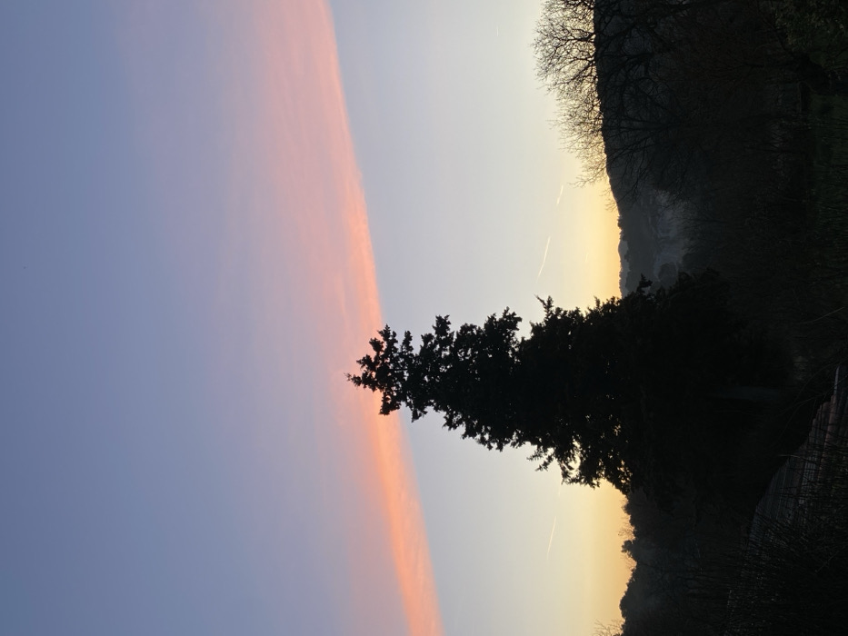 The scene depicts a twilight landscape in Bonnieux, France. A large, dark conifer tree stands silhouetted against the sky, positioned slightly left of the frame's vertical center. The upper sky is a deep blue-purple, transitioning to a lighter blue and then a yellowish-orange near the horizon. A prominent, elongated horizontal band of pink and orange clouds stretches across the upper-middle portion of the sky. Two faint white aircraft contrails are visible: one to the left of the conifer and another lower and to the right. The foreground and midground consist of dark, silhouetted natural vegetation, including additional trees and shrubs, with some bare branches visible on the right. Distant undulating hills are discernible on the horizon, also in silhouette, under a faint atmospheric haze. No human subjects, animals, or artificial structures are visible, apart from the contrails.