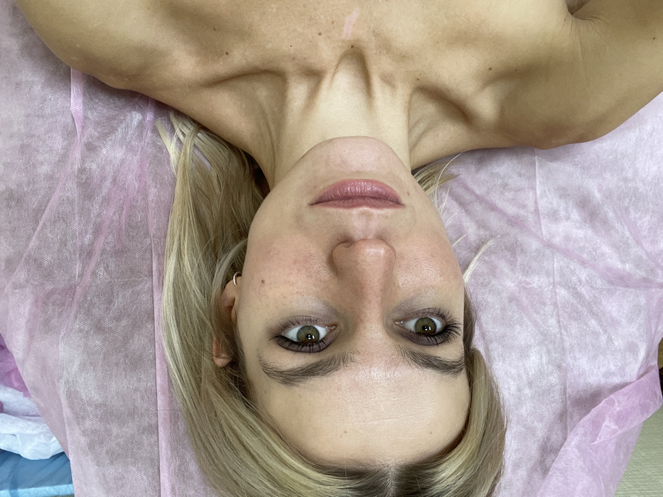 A Caucasian female individual with blonde hair and light-colored eyes is depicted in a supine position, gazing directly at the camera. She lies on a light pink disposable non-woven fabric sheet, with a section of a white and blue disposable sheet visible in the upper left background. Her face displays defined, extended-appearing eyelashes and light pink lipstick. The skin on her face and visible upper torso, including her shoulders and clavicles, is fair-toned, showing minor freckling and a distinct pink linear mark approximately 2cm long on the right clavicular region. The environment suggests a professional cosmetic or medical treatment setting, located in Moscow, Russia.