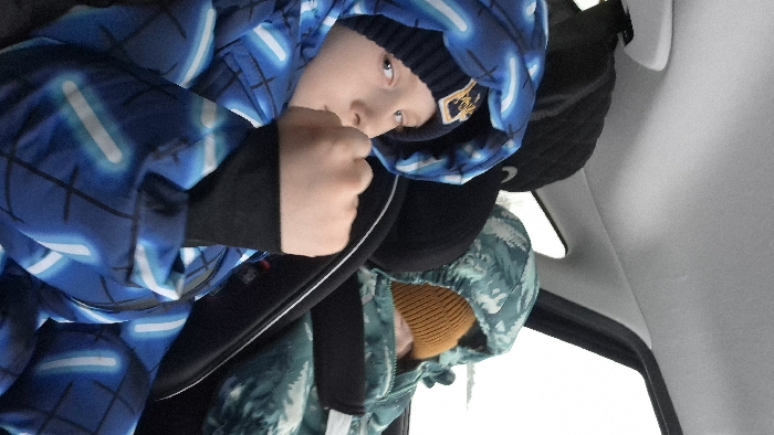 The image captures the interior of a vehicle, reportedly located in Kamennyi Kliuch, Russia, featuring two children in the rear passenger compartment. In the foreground, a child with light hair, appearing to be approximately 5-10 years old, is seated, wearing a dark blue knit beanie with a yellow emblem and a blue winter jacket. The jacket has a distinctive pattern of light blue and white horizontal bars and thin dark intersecting lines. The child's right hand is clenched into a fist at chest level, with a black cuff visible at the wrist. The child's gaze is directed towards the camera. Behind and to the right, a second, younger child, possibly an infant or toddler, is secured in a black car seat. This child is dressed in a greenish-blue patterned winter suit with the hood up, partially obscuring their face, which is oriented downwards or away from the camera. A mustard-yellow knit beanie is visible under the hood. A black chest strap or clip is evident across the second child's torso. The vehicle's interior overhead lining and a structural pillar are light gray. The exterior visible through the side window appears uniformly white, consistent with snow cover or an overcast sky.