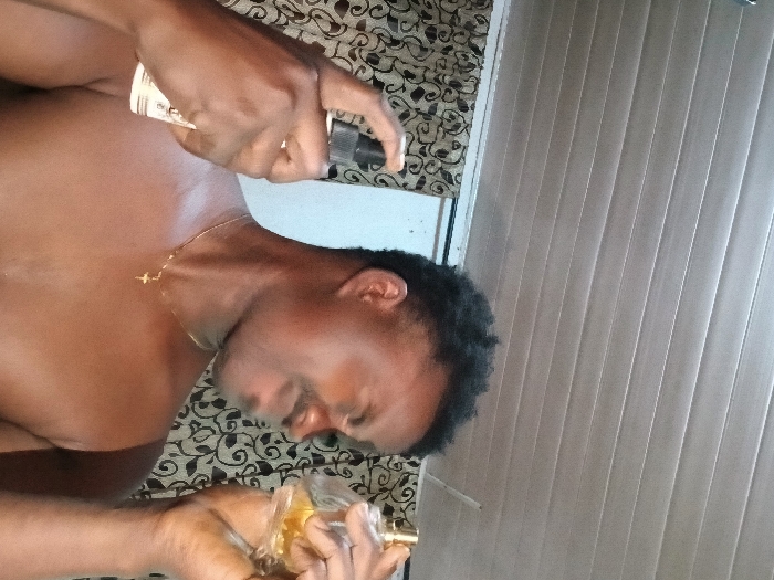 An indoor scene features a shirtless adult male with dark skin and short, dark, textured hair. He wears a thin gold-colored chain with a small cross pendant around his neck. His eyes are squinted or closed, and his mouth is partially open, indicating a strong sensory reaction or discomfort. With his left hand, he holds a white spray bottle with a black pump top, from which a white mist is visible emanating towards his left shoulder area. In his right hand, he holds a small, clear glass bottle containing an amber-colored liquid, consistent with a perfume or cologne bottle. The background behind the subject reveals a brown and cream-colored patterned curtain to the left, and a white slatted ceiling, possibly PVC paneling, occupies the upper portion of the frame. The precise location in Plumtree, Zimbabwe, is not discernible from the visual evidence.
