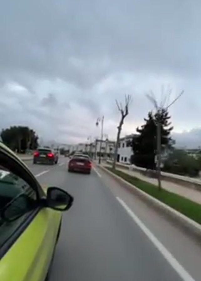 From the perspective of a passenger in a bright yellow or green car, the video shows a road with other cars ahead under an overcast, grey sky