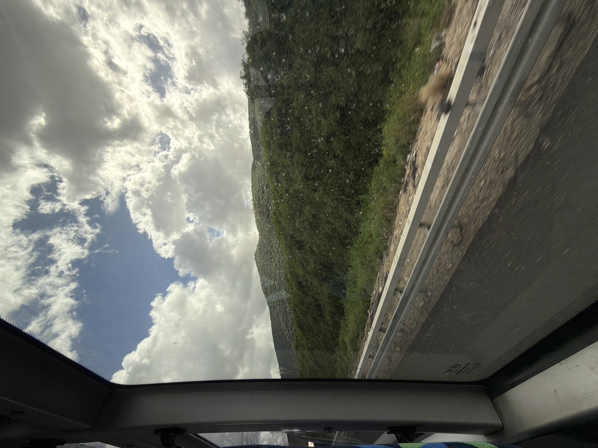 - "The image depicts a view through the open sunroof of a vehicle, likely a car, while traveling on a road" by FM-QclJP2, licensed under CC BY 4.0