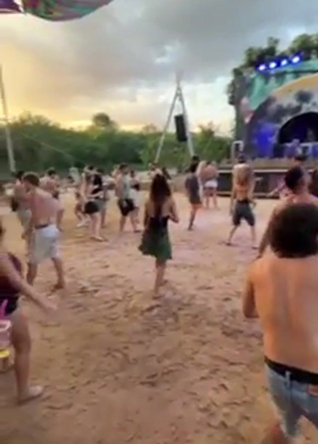 A crowd of people is dancing at an outdoor event. The ground is sandy and there are trees in the background. A stage with psychedelic decorations is visible. Colorful canopies hang overhead. Most people are dressed in casual summer attire, some are shirtless. Some people are standing around talking, while others are actively dancing. The sky is cloudy, suggesting it might be sunset.