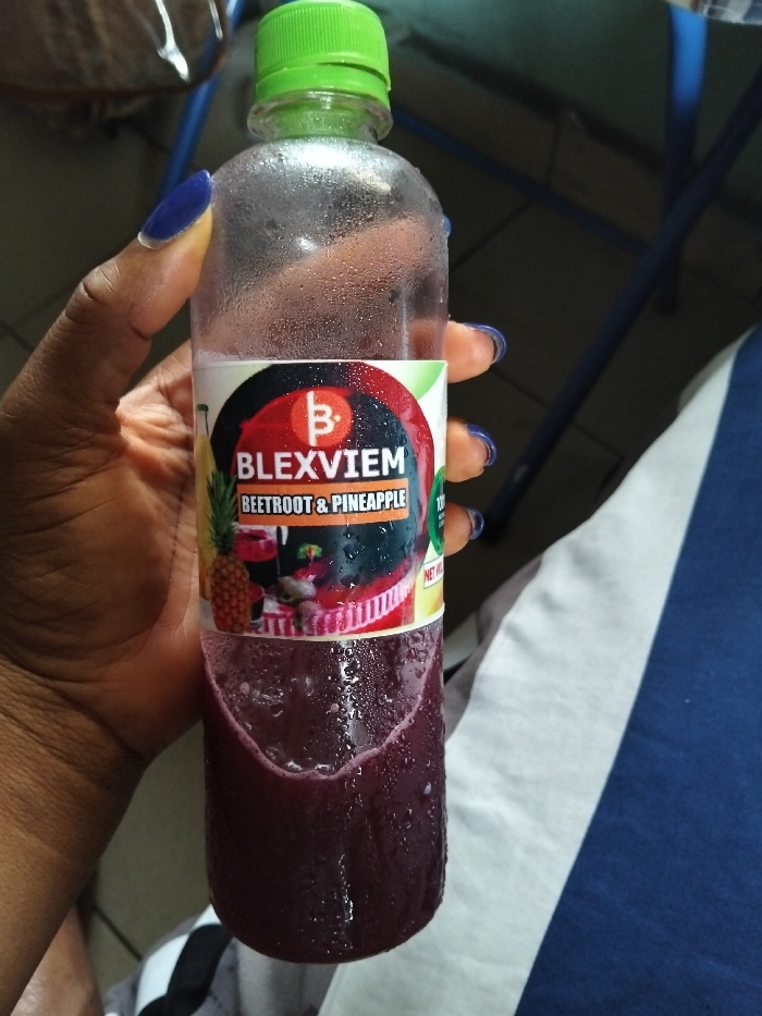 A dark-skinned human hand, featuring dark blue nail polish with clear tips, firmly grips a clear plastic bottle. The bottle contains a dark purplish-red liquid and is covered in condensation, indicating a cold temperature. It is sealed with a bright green screw-on cap. A white label on the bottle displays the brand name "BLEXVIE M," identifying the beverage as "BEETROOT & PINEAPPLE." The label also features a "B" logo and text indicating "100% natural" ingredients, alongside graphic representations of beetroot and pineapple. The liquid level inside the bottle is approximately three-quarters full. The background includes a partial view of a light-colored tiled floor on the lower left. To the right of the bottle, a surface with alternating dark blue and white stripes, consistent with fabric material, is visible. In the upper right quadrant, dark blue structural elements, possibly part of a piece of furniture, are present in a dimly lit area. The precise location within Port-Harcourt, Nigeria, is not discernible from the visual evidence.