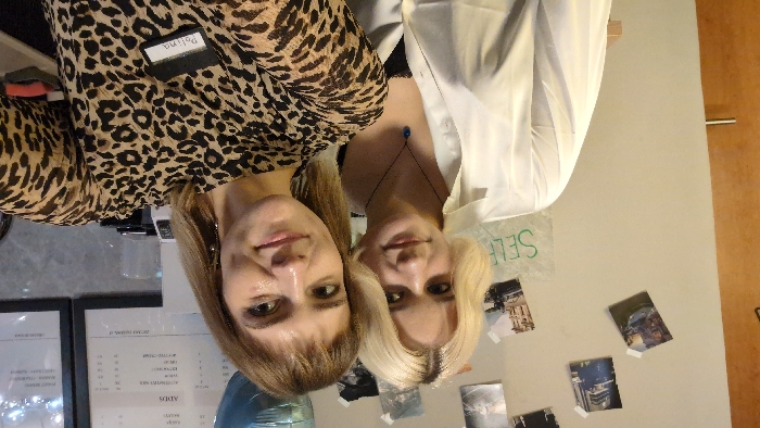 Two women pose closely together. The woman on the left wears a leopard print top and a name tag. The woman on the right wears a white button-down shirt and a delicate necklace. They both have blonde hair and are smiling slightly. The background includes a menu board, some decorations on a wall, and what appears to be a wooden door.