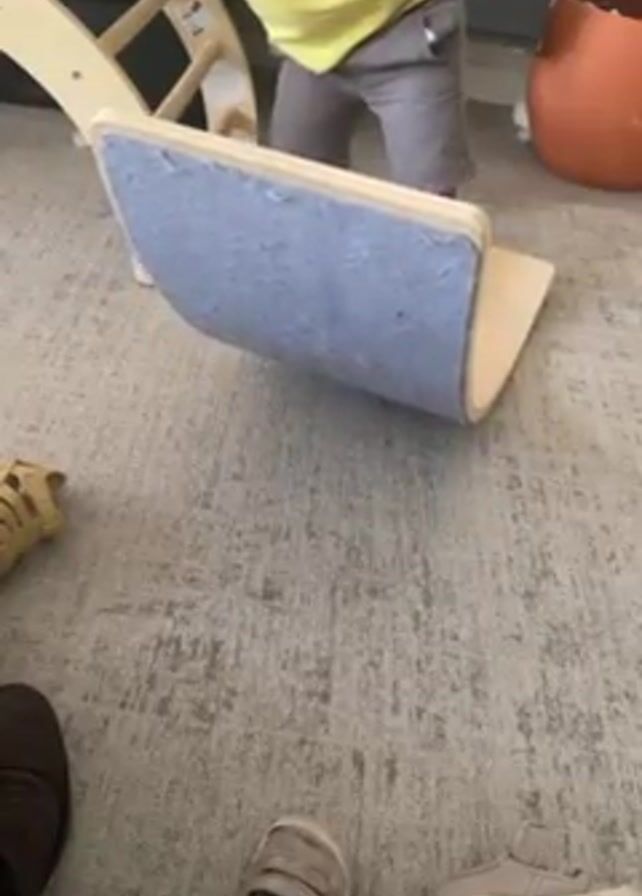 A child wearing a green shirt and gray shorts is walking on a wooden balance board in an indoor space. The child has a white cast on their left arm. The balance board is curved and has gray padding on one side. The floor is covered with a gray and white patterned carpet. Several pairs of shoes are scattered around the base of the balance board, including a brown pair, a pair of children's sandals, and a pair of gray sneakers. A wooden climbing frame is visible in the background, along with a large orange pot. The person filming the video is partially visible on the left.