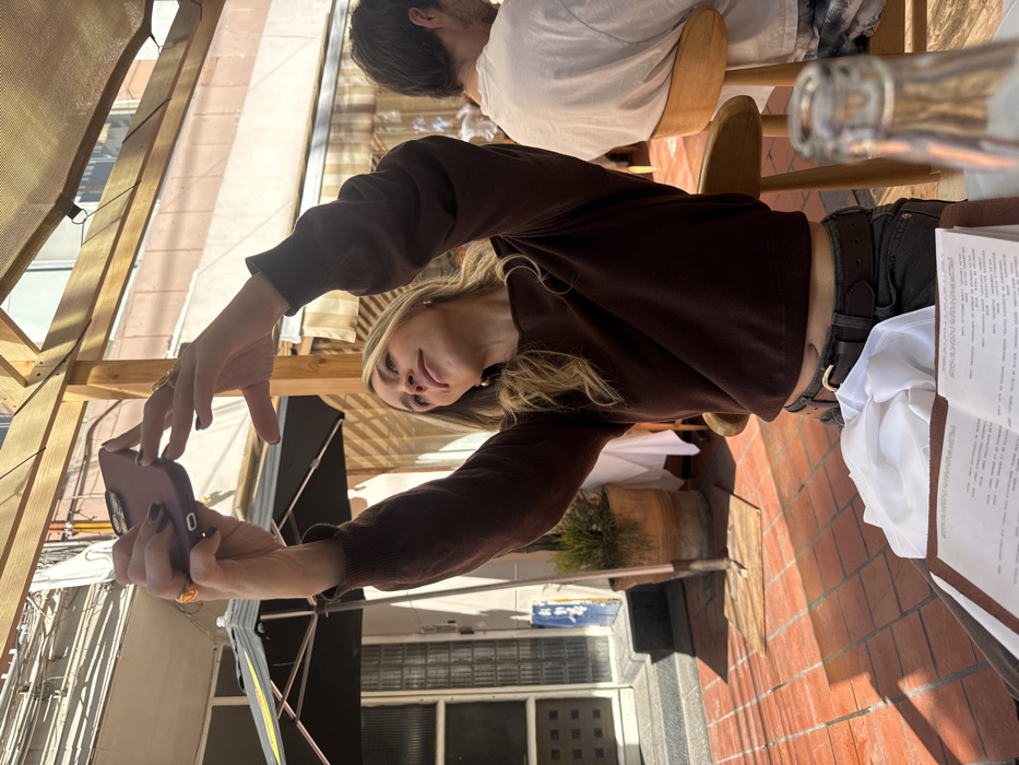 A young woman with blonde hair is holding a cell phone and taking a selfie. She is wearing a brown long-sleeved shirt and dark pants with a belt. She is standing on a brick patio, possibly at an outdoor restaurant, with a menu visible on the table. Another person is seated behind her. A building and awning are partially visible in the background. The photo appears to be taken from a slightly tilted angle.