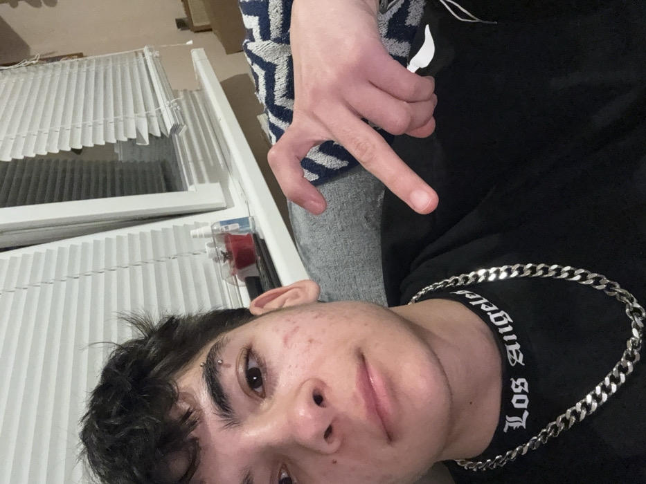 The scene depicts a young individual in an indoor residential setting identified as Sofia, Bulgaria. The individual, positioned off-center to the left, is seen from the chest up, with short dark hair, an eyebrow piercing on the viewer's left eyebrow, and minor skin blemishes on the face. They are wearing a black long-sleeved shirt with "Los Angeles" in white text on the collar, and a thick silver-colored chain necklace. The individual's right hand is in the foreground, forming a half-heart gesture with the thumb and index finger. In the background, a white window frame is visible with white horizontal blinds that are partially open and slightly damaged or dislodged on the right side. On the windowsill, a clear glass container holding a red object (possibly a candle), a white spray bottle, and a dark, rectangular object (possibly a remote control) are present. A blue and white patterned blanket is draped over a grey surface behind the individual's right shoulder and arm. A white tag is visible hanging from the individual's shirt near the right armpit area. Lighting is consistent with an interior, possibly low-light or artificially lit environment.