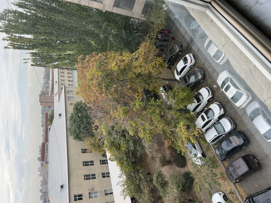 An overhead view from a window in Yerevan, Armenia, depicts an urban scene with a parking area, trees, and buildings under an overcast sky