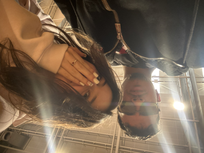 The image depicts two young adult individuals in a close-up, informal portrait likely taken as a selfie. The individual on the left, a male, is partially visible from the chest up. He has short, dark hair, a light mustache, and a subtle beard line. He wears dark, rectangular-framed sunglasses, a dark t-shirt with an indiscernible logo, and a dark, zippered hoodie. His mouth is slightly open, and his expression is neutral, directed towards the camera. The individual on the right, a female, is visible from the upper chest. She has long, dark hair cascading over her shoulders and partially obscuring the right side of her face. Her left hand is raised, covering the lower half of her face (mouth and nose area). Her fingernails are painted white with a faint patterned design. A ring with a small, heart-shaped stone is visible on her left ring finger. She wears a light-colored, long-sleeved top, possibly a hoodie. Her visible left eye is directed towards the camera, suggesting an expression of shyness or amusement. The background indicates an indoor environment with a high ceiling. Exposed white or light-colored ceiling structures, possibly beams or trusses, are visible, along with industrial-style overhead lighting fixtures that produce noticeable lens flare in the upper left portion of the image. Ducts or pipes are also discernible overhead. The setting appears to be a large commercial or public building. The specific location in Panagyurishte, Bulgaria, is not discernible from the visual information presented.
