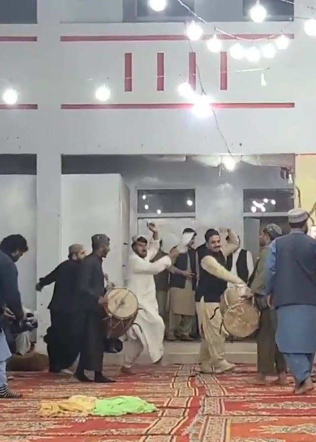 The video depicts a group of men dancing in what appears to be an outdoor celebration. The men are dressed in traditional clothing, with many wearing shalwar kameez, and some wearing head coverings. A few men play drums as the others dance, raising their arms and moving to the rhythm. The event takes place on a large red carpet with an ornate pattern. The backdrop includes a building with white walls, decorated with red accents, and strings of lights hang above the area. Some people sit along the side, observing the dance. A gold and patterned curtain provides a backdrop to one side of the dancing area. There are open areas to the sides of the dancing area.