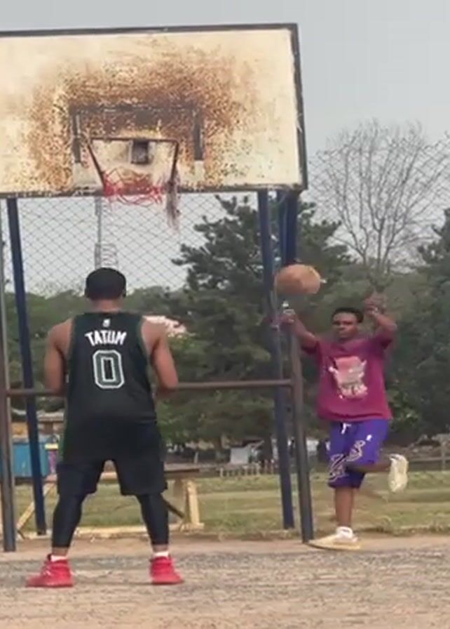 The footage depicts two men engaging in an outdoor basketball game on a slightly worn-out court. One man, wearing a black jersey with the name "Tatum" and the number 0, is seen shooting a basketball toward the hoop. The other man, dressed in a pink shirt and purple shorts, stands nearby, watching the shot. The basketball hoop appears old and rusty, with a weathered backboard. The surroundings include trees and what appears to be a simple, wire-mesh fence.