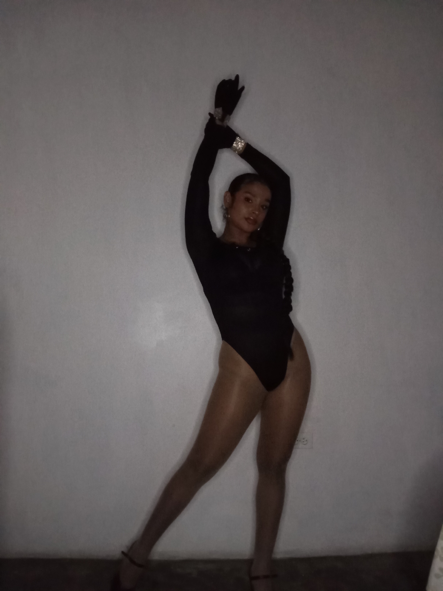 A person is posing indoors against a plain, light-colored wall. The individual is wearing a black long-sleeved bodysuit, sheer tights, and heels. Both hands are raised above the head, and it appears that they are wearing gloves with jewelry on the wrists. The person is facing the camera and slightly angled to their left. The setting seems to be a simple interior space. The location in the city of Juan Griego, Venezuela, cannot be inferred based on the image.