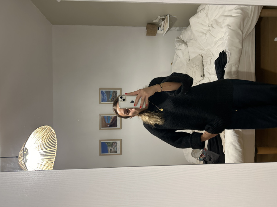 A woman in a black outfit stands in front of a mirror, holding her phone to take a picture of herself