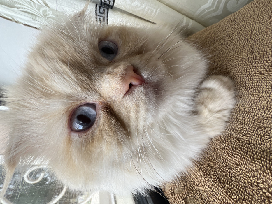 A light-colored, fluffy cat with blue eyes is looking directly into the camera