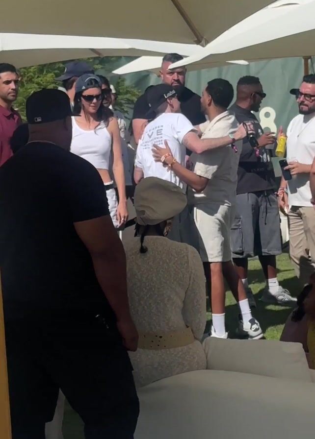 sunny outdoor gathering under large white umbrellas. People are mingling, some standing and talking, others sitting on white patio furniture. Most of the people are dressed in casual summer attire. Some appear to be greeting each other with hugs. Several security guards in black are present. There's a green lawn visible in the background. Music is playing.