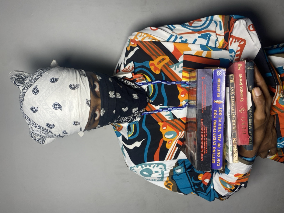 A person, with eyes visible between two bandanas, holds a stack of books. The person wears a vibrant, patterned shirt and a blue beaded necklace. The books' spines reveal titles like "ALIKO MOHAMMAD DANGOTE: Biography," "GETTING EVERYTHING YOU CAN OUT OF ALL YOU'VE GOT," "LIVING THE INFINITE WAY," "HERO," and "TIMELY MESSAGES." The books are held by a hand adorned with a blue bracelet. The background is a neutral gray.