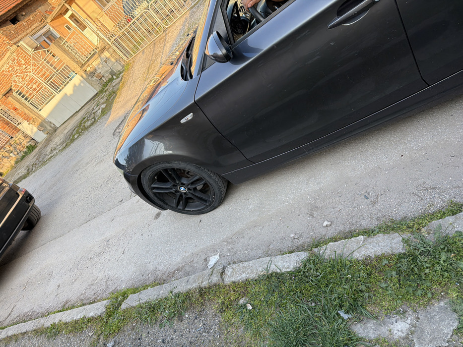 The image displays an outdoor street scene in Dimitrovgrad, Bulgaria, illuminated by warm, low-angle sunlight. A dark grey BMW 1 Series (F20/F21 generation) car occupies the right side of the frame, angled towards the upper left. Visible vehicle components include the front left fender, a black multi-spoke alloy wheel, the driver's side mirror, and a portion of the driver's door. A light-skinned hand is observable on the steering wheel inside the car. The BMW rests on a paved, grey roadway. To the left, a concrete curb separates the pavement from an unkempt strip of ground featuring green grass, weeds, and minor debris. Further down the street, partially visible behind the BMW, is the rear section of a black SUV or large car, showing its bumper and a wheel. In the background, a two-story residential building constructed of reddish-brown bricks is discernible. This building exhibits white-framed windows, some fitted with white metal security bars, and a white garage door. The sunlight casts distinct shadows across the scene.