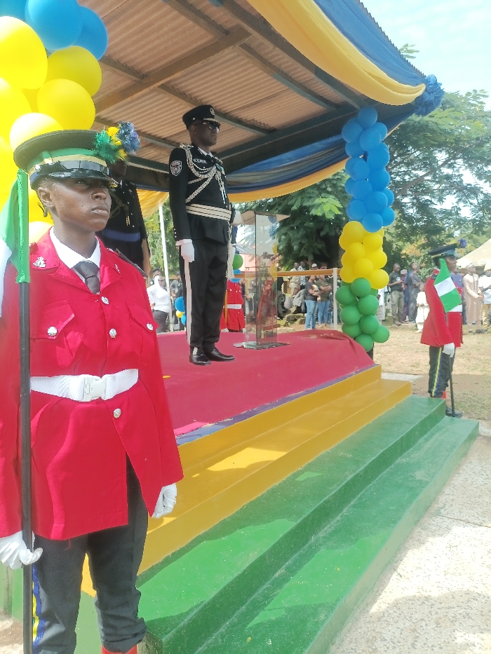 This image captures an outdoor ceremonial event in Kaduna, Nigeria. In the foreground, a young male, likely a cadet, stands at attention, facing slightly to the right of the camera. He wears a red ceremonial jacket with silver buttons, black trousers, a white shirt, black tie, white gloves, and a white belt with a silver buckle. A dark green cap with gold trim and a green band covers his head. He holds a flagpole bearing a Nigerian flag (green and white). To his right, positioned on an elevated stage with three steps painted green, yellow, and green (from bottom to top), an adult male in a dark blue or black ceremonial uniform stands at attention. His uniform includes elaborate silver braiding, epaulets, a white belt, white gloves, black polished shoes, sunglasses, and a dark cap with a crest. Behind him is a clear acrylic or glass speaker's podium. The stage's overhead structure is draped with blue and yellow fabric. On the right side of the stage, a vertical column of blue, yellow, and green balloons is present as decoration. Additional yellow and blue balloons are visible on the left. In the background, a crowd of people is observed, with some individuals standing under trees. Another uniformed person in a red jacket holding a Nigerian flag is partially visible on the far right. The scene is illuminated by daylight under a bright sky.