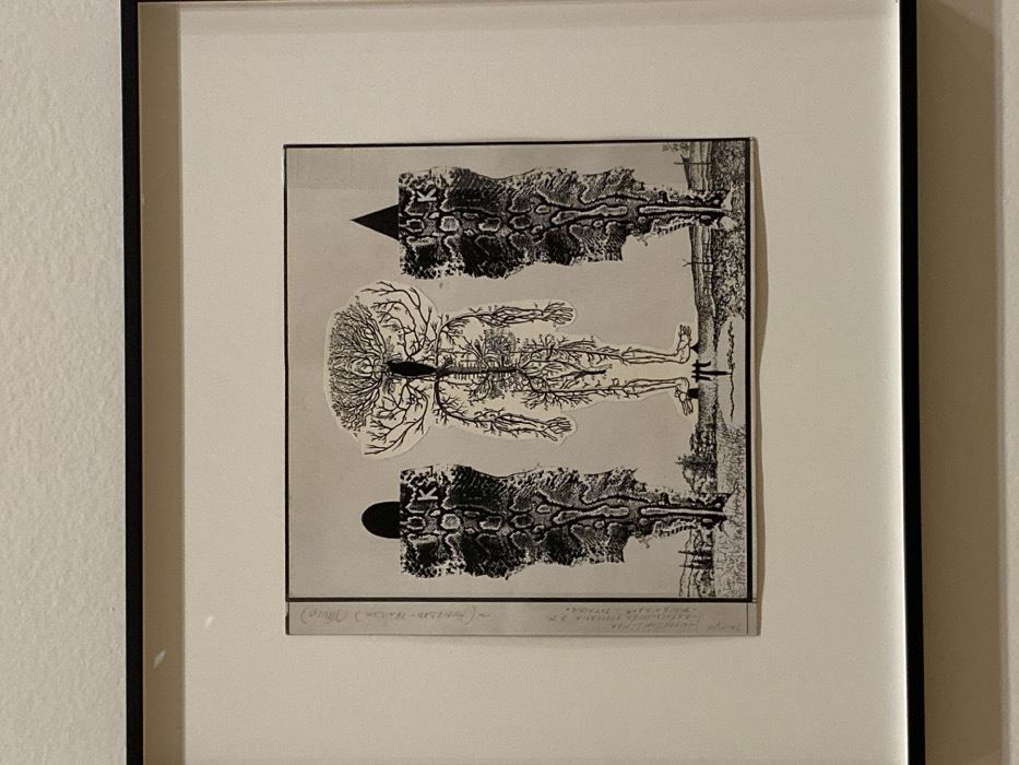 A framed, black-and-white collage or mixed-media artwork is displayed on a plain, light-colored wall in Bilbao, Spain. The artwork is housed within a black, thin-edged frame with a white mat board. The central image depicts three anthropomorphic figures standing on a desolate, horizontal landscape under a light grey sky. The central figure is a full anatomical illustration of a human body, rendered with a light tone, showcasing an intricate network of nerves or vessels, with tree-like branches extending from the head and neck. This figure appears to be a cut-out pasted onto the background. Flanking the central figure are two dark, textured, column-like figures with surfaces resembling snakeskin or intricate patterns. The figure on the left has a rounded, black cap-like top, with the letters "Tuck'S" visible on its upper torso. The figure on the right features a pointed, black triangular cap-like top, with the letter "K" visible on its upper torso. The background of the artwork is a sparse landscape with a flat horizon, scattered small trees or shrubs, and faintly visible structures resembling wind turbines in the distance on the right. A vertical strip of faded text, possibly a title, signature, or inscription, runs along the left edge of the artwork, partially obscured by the matting. The immediate environment outside the frame consists solely of the unadorned wall.