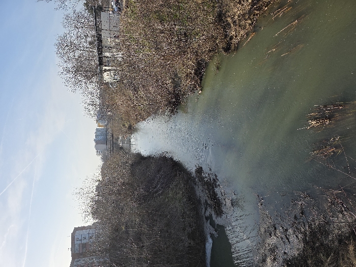 - "The image displays an urban waterway, likely a canal or small river, in Byala Slatina, Bulgaria, under a clear, pale blue sky with two visible aircraft contrails" by FM-rp3GD2, licensed under CC BY 4.0