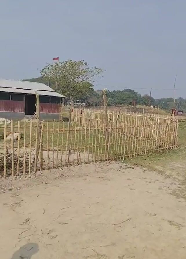 dirt and grass field enclosed by a light-colored bamboo fence. A small, one-story building with a corrugated metal roof stands on the edge of the field, and a red flag flies atop the building. A single tree stands beside the building. The sky is clear and pale blue. In the distance, trees and buildings are visible. There are no people or animals in the immediate foreground. The camera pans slightly to the right. The overall impression is of a rural or agricultural setting.